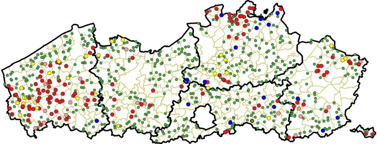 CVBB resumeert: “Het aantal nieuwe rode punten is beduidend hoger dan vorig jaar (35 tegenover 21). Bijna in alle provincies stijgt het aantal nieuwe rode punten. Deze worden niet gecompenseerd door de nieuwe groene punten (nu 28, vorig jaar 56!).” Fraaier dan de korte termijn oogt de evolutie op middellange termijn: in tien jaar tijd is het aantal rode meetpunten bijna gehalveerd. Vooral Oost-Vlaanderen (van 50 naar 15) en West-Vlaanderen (van 142 naar 70) hebben hiertoe bijgedragen. Vlaams-Brabant en Antwerpen reduceerden het aantal rode meetpunten het voorbije decennium met ongeveer een derde en Limburg met 20 procent.