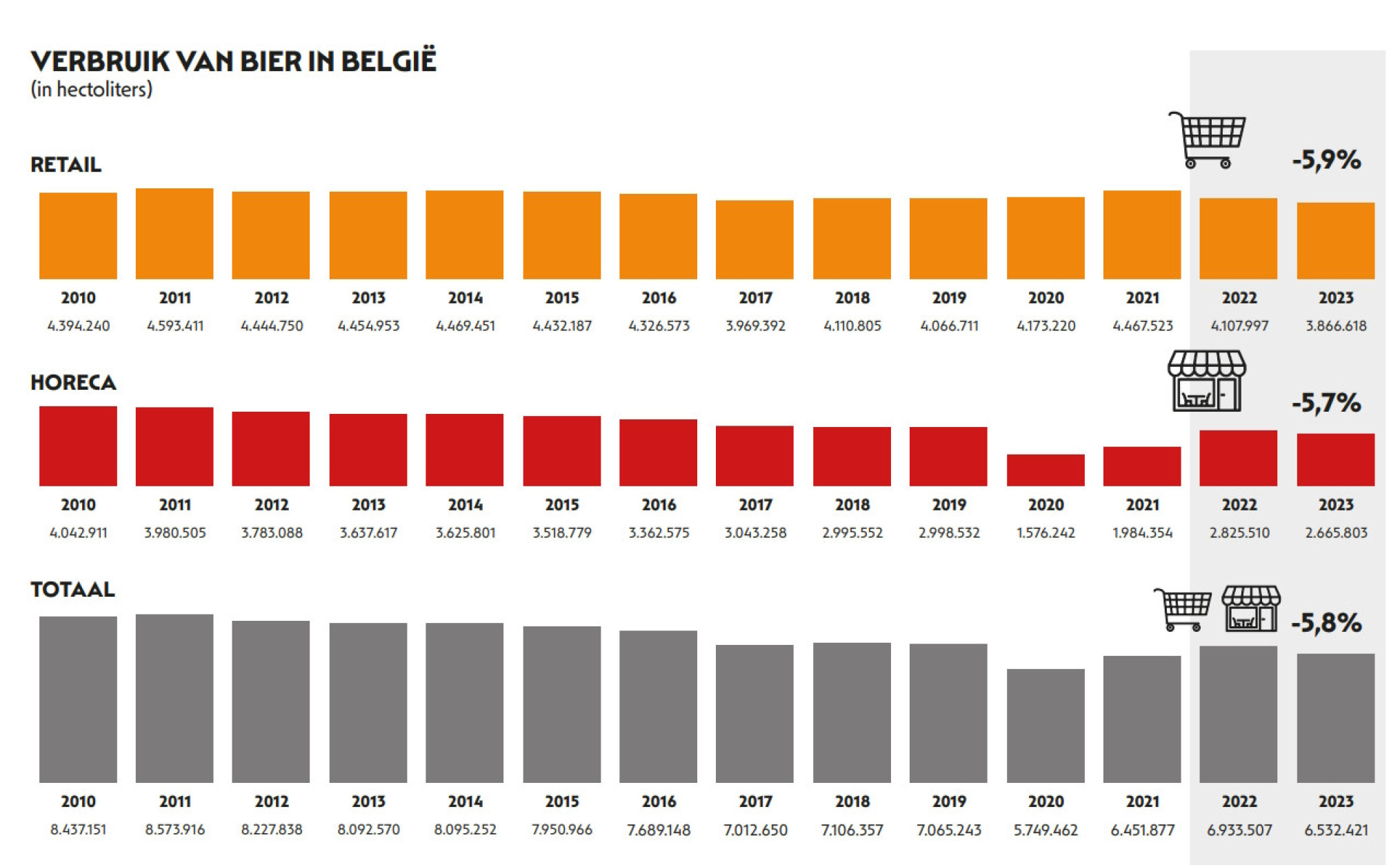 In 2023 daalde zowel het binnenlands verbruik in de horeca (-5,7 procent) als in de retail (-5,9 procent). 70 procent van de productie is voor de export bestemd. Vorig jaar openden 23 nieuwe brouwerijen de deuren, tegenover 36 sluitingen. Eind 2023 waren er zo 417 brouwerijen in heel België (-13), goed voor 6.927 directe banen en 1.600 merken. De brouwers investeerden in 2023 samen 251 miljoen euro.