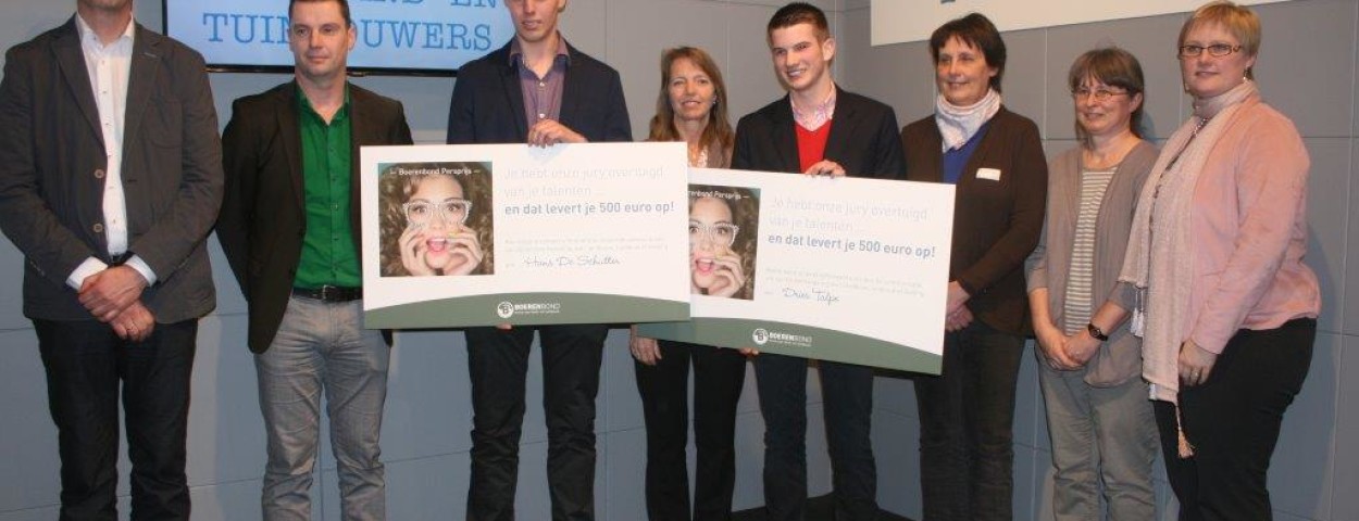 Dries Talpe en Hans De Schutter ontvingen de Boerenbond Persprijs van Anne Vandenborre, directeur communicatie, en Boerenbondvoorzitter Sonja De Becker. Beide studenten slaagden erin om hun praktijkgericht onderzoek begrijpelijk neer te pennen in een artikel dat verscheen in de vakpers. Hun artikels verschenen in Management&Techniek, het halfmaandelijkse magazine van Boerenbond met vaktechnische informatie voor de verschillende deelsectoren.
