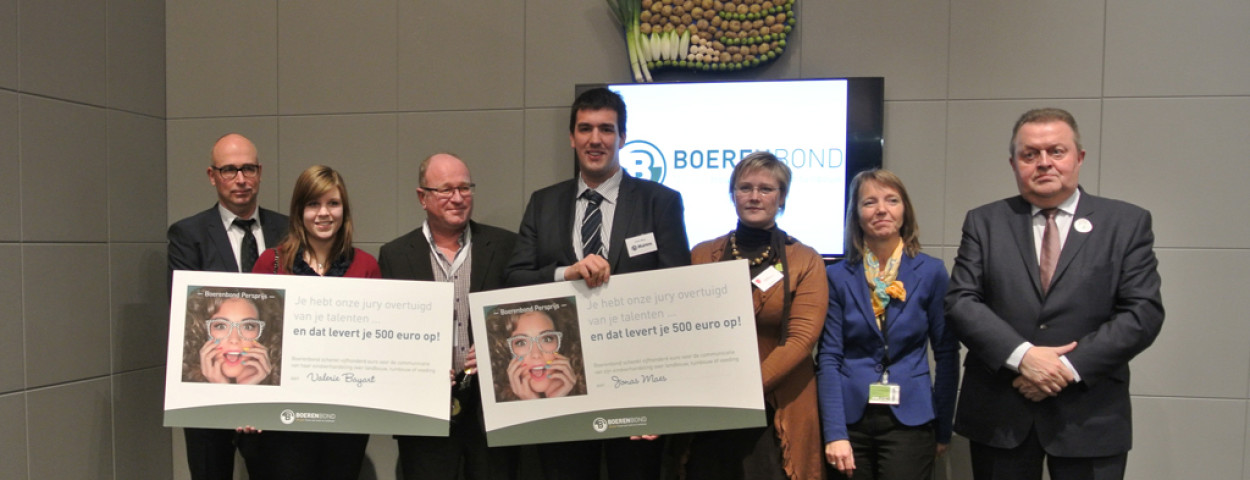 nieuwsNaar goede gewoonte reikte Boerenbond ook dit jaar een persprijs uit aan twee studenten uit een land- of tuinbouwkundige opleiding. Om de prijs te winnen moesten de studenten hun eindverhandeling in een vlot leesbaar artikel gieten en dat illustreren met voldoende grafieken, zonder te vervallen in wetenschappelijk jargon. Bedoeling is om wetenschappelijk onderzoek ingang te laten vinden bij een breder publiek. Bij de bachelors kaapte Valerie Bayart de prijs weg met haar artikel “Valt robotmelken te combineren met weidegang?”. Bij de masters won Jonas Maes met zijn artikel “Immunocastraten of intacte beren behouden?”. Beide laureaten ontvingen 500 euro en zien hun artikel gepubliceerd in Management & Techniek. De uitreiking ging door op de landbouwbeurs Agriflanders.