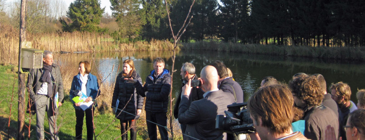 nieuwsOp het fruitteeltbedrijf van Stefan Veulemans in Kortenaken introduceerden projectpartners uit Vlaanderen en Nederland de grensoverschrijdende samenwerking ‘Meer natuur voor pittig fruit’. De fruitsector maakt zich zorgen over de achteruitgang van de bijenpopulatie. Gedeputeerde Inge Moors neemt zelfs het woord ‘bestuivingscrisis’ in de mond. Met de maatregelen uit het Interreg-project wordt het probleem een halt toegeroepen: fruittelers langs beide zijden van de Belgisch-Nederlandse grens nemen maatregelen om het bijen naar hun zin te maken. Onder impuls van de Regionale Landschappen vergroot de biodiversiteit ook in het ruimere landschap rond de fruitplantages. “Als wij oog hebben voor de natuur, dan kan de natuur zijn werk doen”, maken gedeputeerden Monique Swinnen en Mark Florquin duidelijk waar het project om draait.
