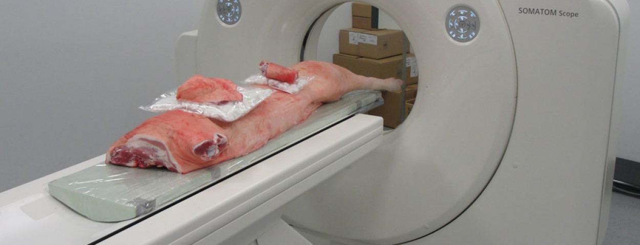 duidingComputer tomografie, kortweg CT, is een techniek die al jaren in de humane geneeskunde wordt gebruikt. Via CT willen dokters een inwendig beeld verkrijgen van een patiënt, zonder dat er op een destructieve manier te werk wordt gegaan. De techniek heeft ondertussen zijn weg gevonden in andere toepassingsgebieden. De Cel Begeleiding Karkasclassificatie (CBKc), verbonden aan de vakgroep Dierlijke Productie van de Universiteit Gent, tracht te onderzoeken of in België CT gebruikt kan worden om het aandeel mager vlees in een varkenskarkas te bepalen.