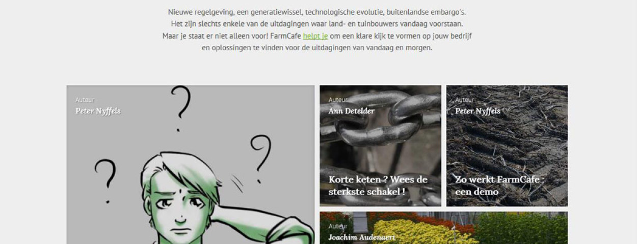 Op FarmCafe.be kunnen landbouwbedrijven inspiratie opdoen via getuigenissen van andere ondernemers, soms aangevuld met professioneel advies van experten. Ze kunnen ook deelnemen aan webinars of ze op een later tijdstip bekijken. Uniek aan de website is dat de bezoeker een werkgroep kan oprichten in een aparte, beveiligde digitale ruimte, waar hij in een besloten groep advies kan inwinnen en ideeën van experts kan aftoetsen om de werking van zijn bedrijf te optimaliseren. Land- en tuinbouwers vormen een zeer hechte gemeenschap waar veel informatie-uitwisseling tussen de bedrijven gebeurt. FarmCafe wil dat nog versterken.