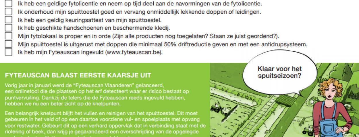 De eerste checklist kreeg de titel ‘Ik ben klaar voor de start van het nieuwe seizoen’. Daarin wordt onder meer gefocust op het belang van de Fyteauscan, een online tool die Phytofar vorig jaar lanceerde om de knelpunten voor puntvervuiling op het erf beter te kunnen detecteren. “Deze scan heeft ons geleerd dat bijvoorbeeld het vullen en reinigen van het spuittoestel nog vaak problemen oplevert. Gebeurt dit in de buurt van een verhard oppervlak dat in verbinding staat met een beek of riolering, dan krijg je automatisch een overschrijding van de opgelegde ecologische kwaliteitsnormen in het oppervlaktewater”, stelt Phytofar.